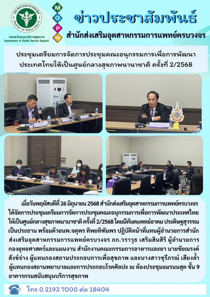เมื่อวันพฤหัสบดีที่ 26 มิถุนายน 2568 สำนักส่งเสริมอุตสาหกรรมการแพทย์ครบวงจร ได้จัดการประชุมเตรียมการจัดการประชุมคณะอนุกรรมการเพื่อการพัฒนาประเทศไทย ให้เป็นศูนย์กลางสุขภาพนานาชาติ ครั้งที่ 2/2568 โดยมีทันตแพทย์อาคม ประดิษฐสุวรรณ เป็นประธาน พร้อมด้วยนพ.จตุพร ทิพยทิฑัมพร ปฏิบัติหน้าที่แทนผู้อำนวยการสำนักส่งเสริมอุตสาหกรรมการแพทย์ครบวงจร ภก.วราวุธ เสริมสินสิริ ผู้อำนวยการกองยุทธศาสตร์และแผนงาน สำนักงานคณะกรรมการอาหารและยา นายชัยณรงค์ สังข์จ่าง ผู้แทนกองสถานประกอบการเพื่อสุขภาพ และนางสาวชุรีภรณ์ เสียงล้ำ ผู้แทนกองสถานพยาบาลและการประกอบโรคศิลปะ ณ ห้องประชุมอมรนนสุต ชั้น 9 อาคารกรมสนับสนุนบริการสุขภาพ