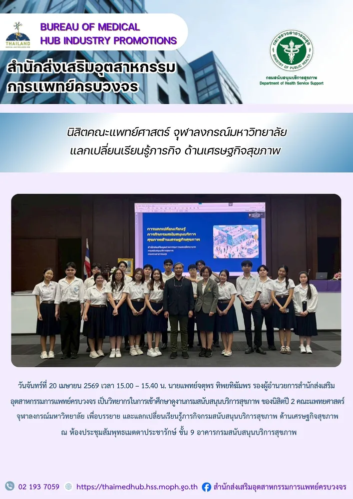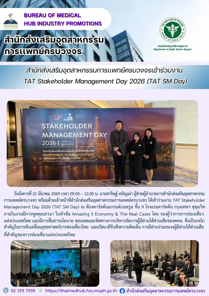 กรม สบส.จับมือ 6 หน่วยงาน จัดประชุมวิชาการนานาชาติ ผลักดันผลิตภัณฑ์การแพทย์ขั้นสูงและอุตสาหกรรมบริการสุขภาพ ขับเคลื่อนเศรษฐกิจสุขภาพสู่เวทีโลก https://www.youtube.com/watch?v=2uW-N5As2zYกรมสนับสนุนบริการสุขภาพ (กรม สบส.) กระทรวงสาธารณสุข เปิดประชุมวิชาการนานาชาติ ผลิตภัณฑ์การแพทย์ขั้นสูงกับการส่งเสริมอุตสาหกรรมบริการสุขภาพเพื่อขับเคลื่อนเศรษฐกิจสุขภาพของประเทศไทย ให้เป็นเวทีในการพัฒนานโยบายและแนวทางในการควบคุมกำกับการผลิตและการให้บริการผลิตภัณฑ์การแพทย์ขั้นสูง ส่งเสริมการเติบโตของอุตสาหกรรมการแพทย์สมัยใหม่ เพื่อขับเคลื่อนเศรษฐกิจสุขภาพของประเทศไทย วันที่ 26 ธันวาคม 2567 …