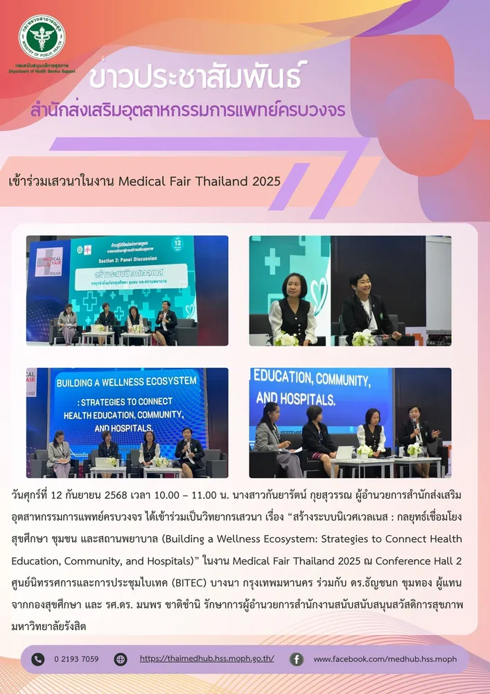 วันศุกร์ที่ 12 กันยายน 2568 เวลา 10.00 – 11.00 น. นางสาวกันยารัตน์ กุยสุวรรณ ผู้อำนวยการสำนักส่งเสริมอุตสาหกรรมการแพทย์ครบวงจร ได้เข้าร่วมเป็นวิทยากรเสวนา เรื่อง “สร้างระบบนิเวศเวลเนส : กลยุทธ์เชื่อมโยงสุขศึกษา ชุมชน และสถานพยาบาล (Building a Wellness Ecosystem: Strategies to Connect Health Education, Community, and Hospitals)” ในงาน Medical Fair Thailand 2025 ณ Conference Hall 2 ศูนย์นิทรรศการและการประชุมไบเทค (BITEC) บางนา กรุงเทพมหานคร ร่วมกับ ดร.ธัญชนก ขุมทอง ผู้แทนจากกองสุขศึกษา และ รศ.ดร. มนพร ชาติชำนิ รักษาการผู้อำนวยการสำนักงานสนับสนับสนุนสวัสดิการสุขภาพ มหาวิทยาลัยรังสิต