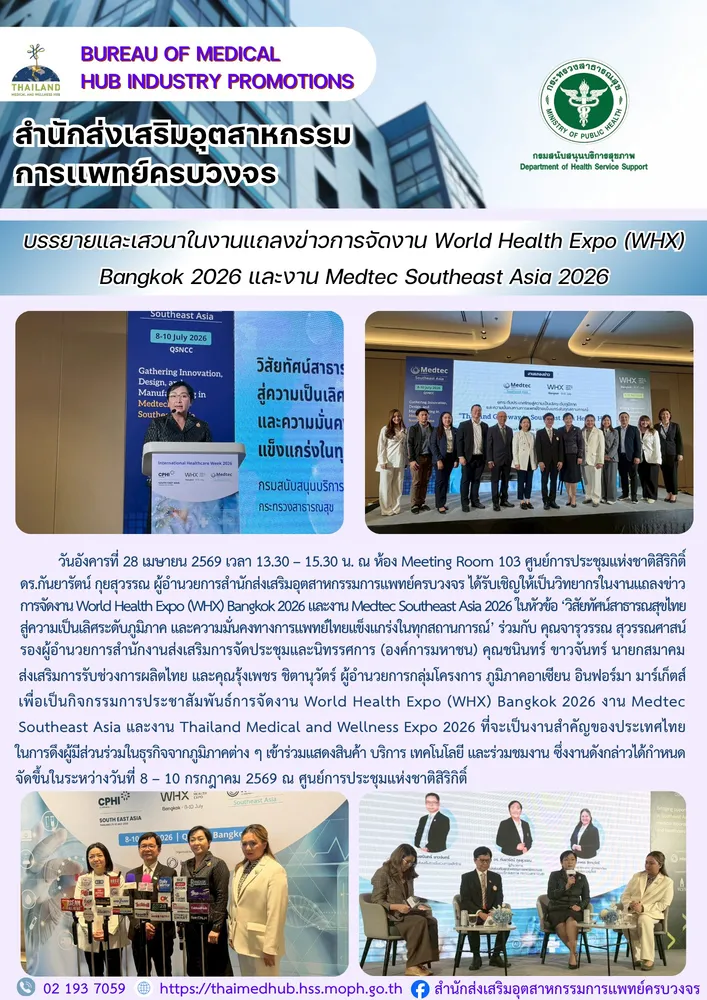วันอังคารที่ 28 เมษายน 2569 เวลา 13.30 – 15.30 น. ณ ห้อง Meeting Room 103 ศูนย์การประชุมแห่งชาติสิริกิติ์ ดร.กันยารัตน์ กุยสุวรรณ ผู้อำนวยการสำนักส่งเสริมอุตสาหกรรมการแพทย์ครบวงจร ได้รับเชิญให้เป็นวิทยากรในงานแถลงข่าวการจัดงาน World Health Expo (WHX) Bangkok 2026 และงาน Medtec Southeast Asia 2026 ในหัวข้อ ‘วิสัยทัศน์สาธารณสุขไทย สู่ความเป็นเลิศระดับภูมิภาค และความมั่นคงทางการแพทย์ไทยแข็งแกร่งในทุกสถานการณ์’ ร่วมกับ คุณจารุวรรณ สุวรรณศาสน์ รองผู้อำนวยการสำนักงานส่งเสริมการจัดประชุมและนิทรรศการ (องค์การมหาชน) คุณชนินทร์ ขาวจันทร์ นายกสมาคมส่งเสริมการรับช่วงการผลิตไทย และคุณรุ้งเพชร ชิตานุวัตร์ ผู้อำนวยการกลุ่มโครงการ ภูมิภาคอาเซียน อินฟอร์มา มาร์เก็ตส์ เพื่อเป็นกิจกรรมการประชาสัมพันธ์การจัดงาน World Health Expo (WHX) Bangkok 2026 งาน Medtec Southeast Asia และงาน Thailand Medical and Wellness Expo 2026 ที่จะเป็นงานสำคัญของประเทศไทย ในการดึงผู้มีส่วนร่วมในธุรกิจจากภูมิภาคต่าง ๆ เข้าร่วมแสดงสินค้า บริการ เทคโนโลยี และร่วมชมงาน ซึ่งงานดังกล่าวได้กำหนดจัดขึ้นในระหว่างวันที่ 8 – 10 กรกฎาคม 2569 ณ ศูนย์การประชุมแห่งชาติสิริกิติ์