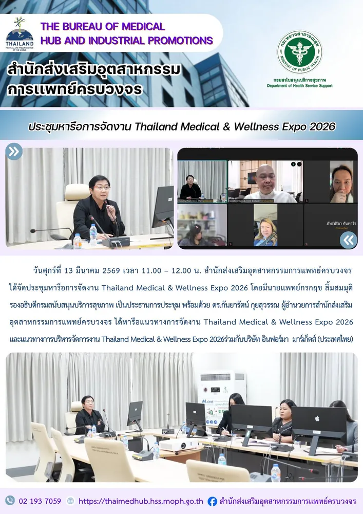 วันศุกร์ที่ 13 มีนาคม 2569 เวลา 11.00 – 12.00 น. สํานักส่งเสริมอุตสาหกรรมการแพทย์ครบวงจร ได้จัดประชุมหารือการจัดงาน Thailand Medical & Wellness Expo 2026 โดยมีนายเเพทย์กรกฤช ลิ้มสมมุติ รองอธิบดีกรมสนับสนุนบริการสุขภาพ เป็นประธานการประชุม พร้อมด้วย ดร.กันยารัตน์ กุยสุวรรณ ผู้อํานวยการสํานักส่งเสริมอุตสาหกรรมการแพทย์ครบวงจร ได้หารือแนวทางการจัดงาน Thailand Medical & Wellness Expo 2026 และแนวทางการบริหารจัดการงาน Thailand Medical & Wellness Expo 2026ร่วมกับบริษัท อินฟอร์มา มาร์เก็ตส์ (ประเทศไทย)