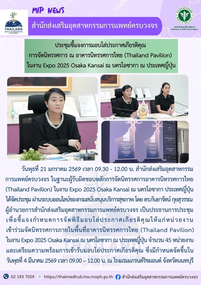 วันพุธที่ 21 มกราคม 2569 เวลา 09.30 – 12.00 น. สำนักส่งเสริมอุตสาหกรรมการแพทย์ครบวงจร ในฐานะผู้รับผิดชอบหลักการจัดนิทรรศการอาคารนิทรรศการไทย (Thailand Pavilion) ในงาน Expo 2025 Osaka Kansai ณ นครโอซากา ประเทศญี่ปุ่น ได้จัดประชุม ผ่านระบบออนไลน์ของกรมสนับสนุนบริการสุขภาพ โดย ดร.กันยารัตน์ กุยสุวรรณ ผู้อำนวยการสำนักส่งเสริมอุตสาหกรรมการแพทย์ครบวงจร เป็นประธานการประชุม เพื่อชี้แจงกำหนดการจัดพิธีมอบโล่ประกาศเกียรติคุณให้แก่หน่วยงานเข้าร่วมจัดนิทรรศการภายในพื้นที่อาคารนิทรรศการไทย (Thailand Pavilion) ในงาน Expo 2025 Osaka Kansai ณ นครโอซากา ณ ประเทศญี่ปุ่น จำนวน 45 หน่วยงาน และเตรียมความพร้อมการเข้ารับมอบโล่ประกาศเกียรติคุณ ซึ่งมีกำหนดจัดขึ้นในวันพุธที่ 4 มีนาคม 2569 เวลา 09.00 – 12.00 น. ณ โรงแรมแกรนด์ริชมอนด์ จังหวัดนนทบุรี